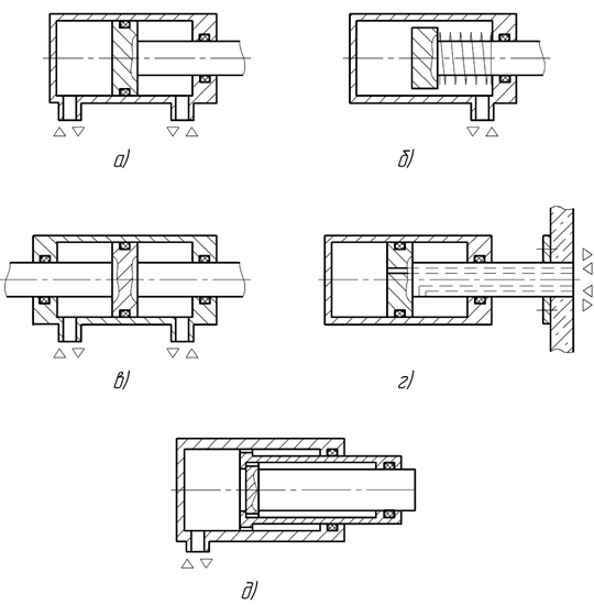Жидкость в гидравлические цилиндры подается через шток (рис. 2, д) или гильзу (рис. 2, а). Бывают модели с односторонними (рис. 2, а) и двусторонними (рис. 2, в) штоками. В первых поршень соединен с одним штоком, во вторых — с двумя. Двусторонние штоки также называют проходными.
